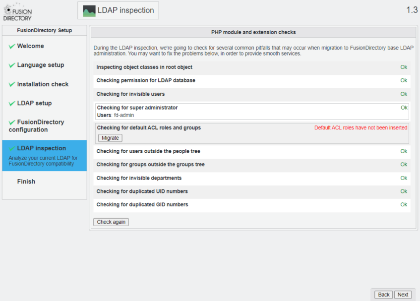 Checking for default ACL roles and groups の [Migrate] を click